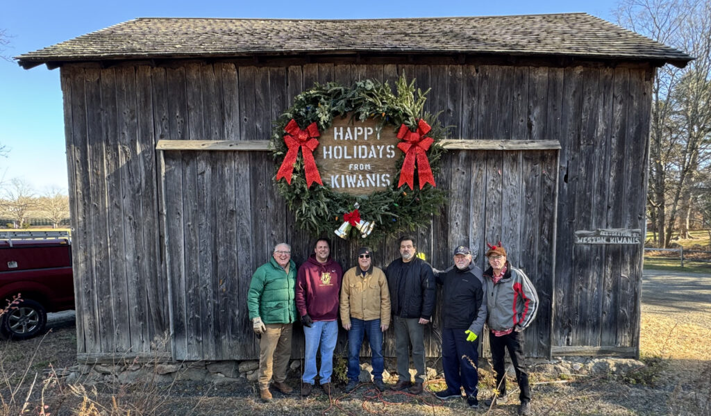 Led by Steve Thomas, Weston Kiwanians expertly installed the “Happy Holidays” wreath on Saturday, November 29, on Weston’s historic onion barn.