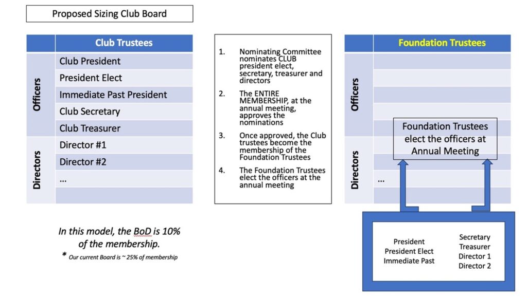 The proposed bylaws changes will right-size the club board and the foundation board to reflect our membership numbers. Each board consists of elected officers and directors.